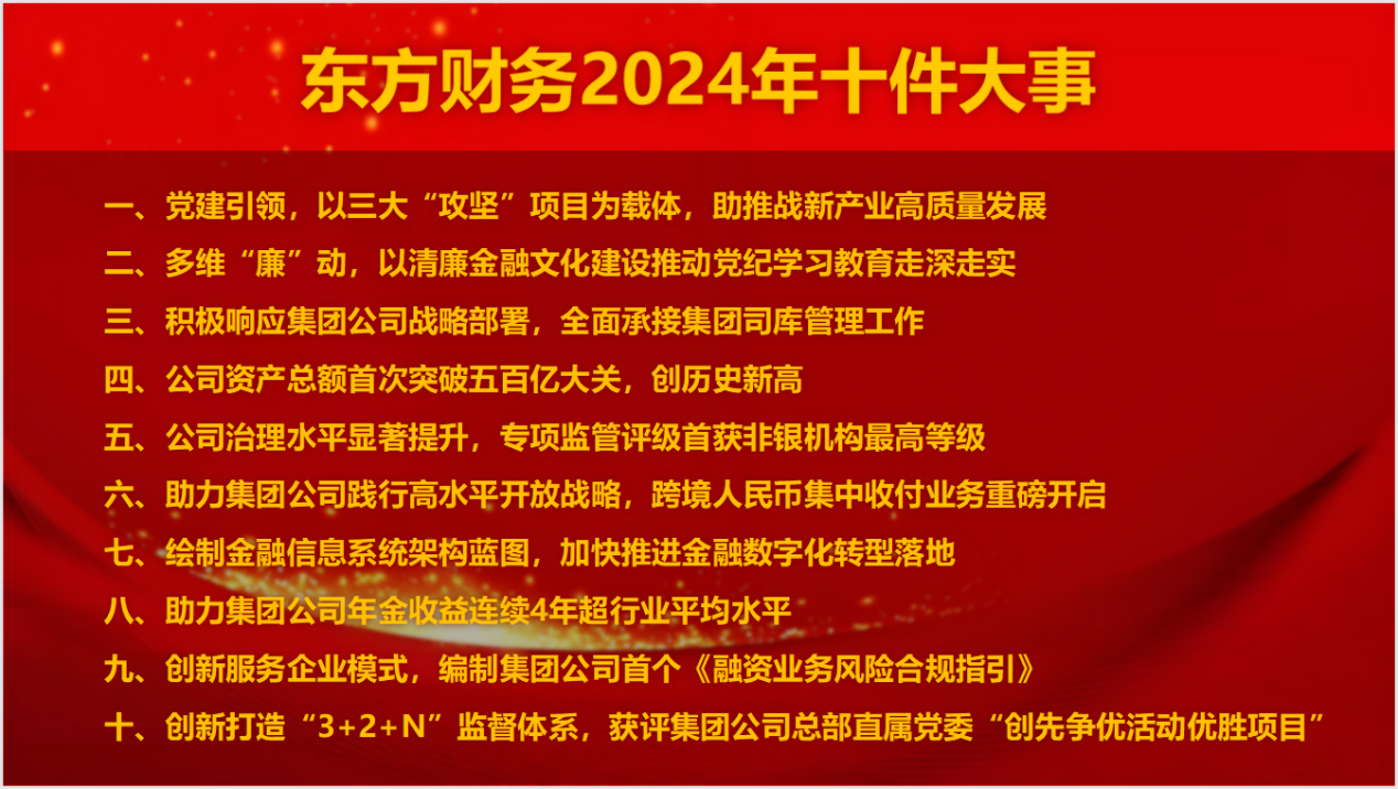 2024年,PA视讯在线官网财务认真贯彻落实党中央的决策部署,落实集团公司领先战略和“11256”发展战略,聚焦公司年度目标和重点任务,上下一心、团结奋进,取得了良好成效。为全面总结回顾2024年公司取得的丰硕成果,进一步增强干部职工的成就感和自豪感,经全体员工投票,推选出“PA视讯在线官网财务2024年度十件大事”: